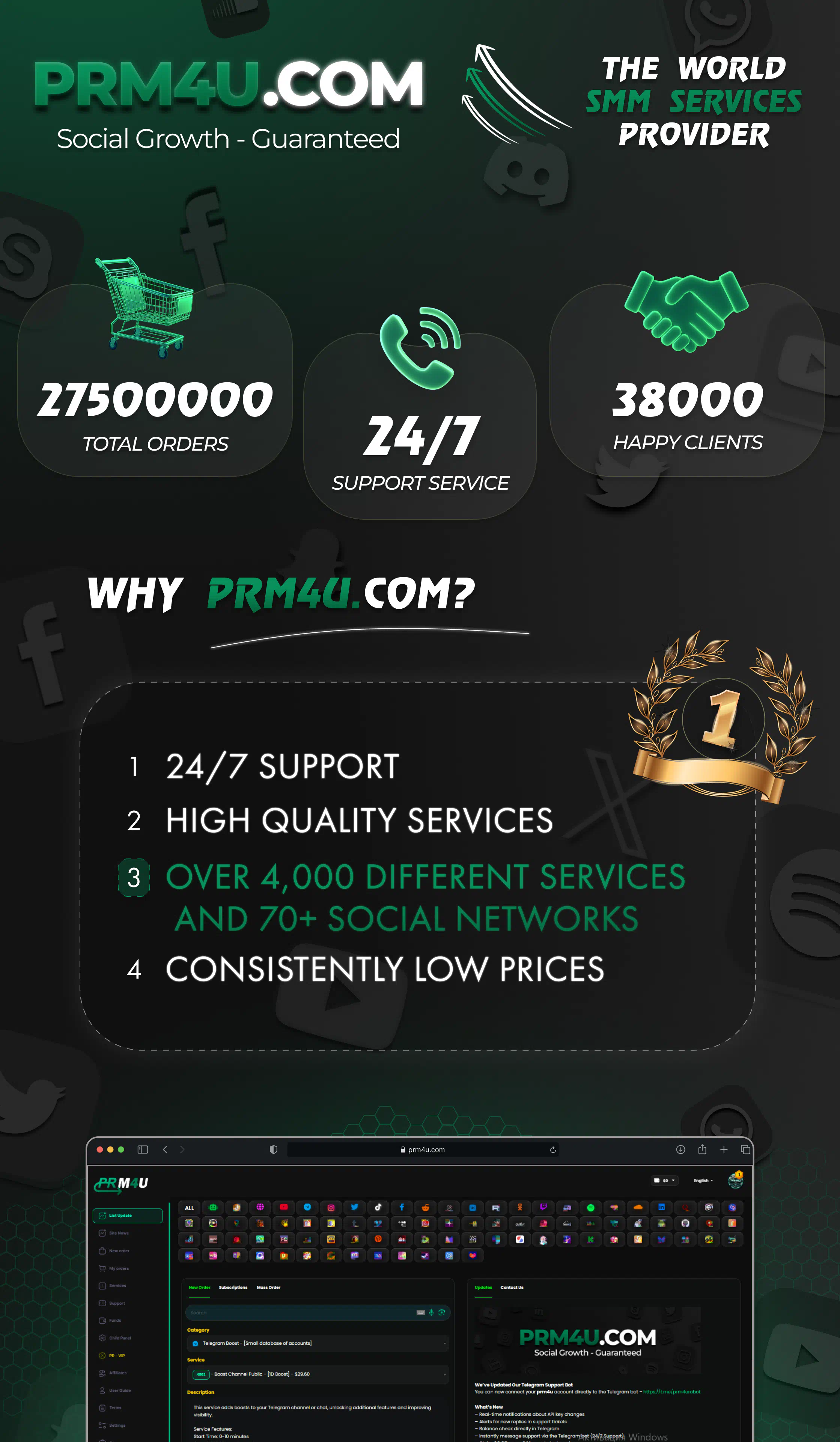 https://prm4u.com is an SMM panel for automated social media promotion. It supports more than 70 social networks, including Telegram, TikTok, Instagram, YouTube, Twitter (X), Reddit, Discord, Threads, Facebook, LinkedIn, and others.
